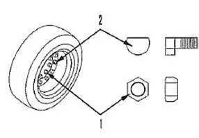 6.將一個(gè)替換輪胎安裝至輪轂。暫時(shí)地?cái)Q緊輪轂螺母(1) ,對角地?cái)Q緊螺母。