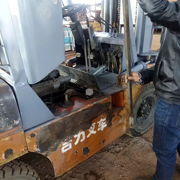 5、不以標準叉車來比對參數(shù):如輪胎型號、門架結構、配重(實鐵的用錘子敲的時候聲音“丁丁”;水泥的只是鐵皮包圍,中間是水泥,鐵錘敲的時候聲音“咚咚”)和車架不能分離。